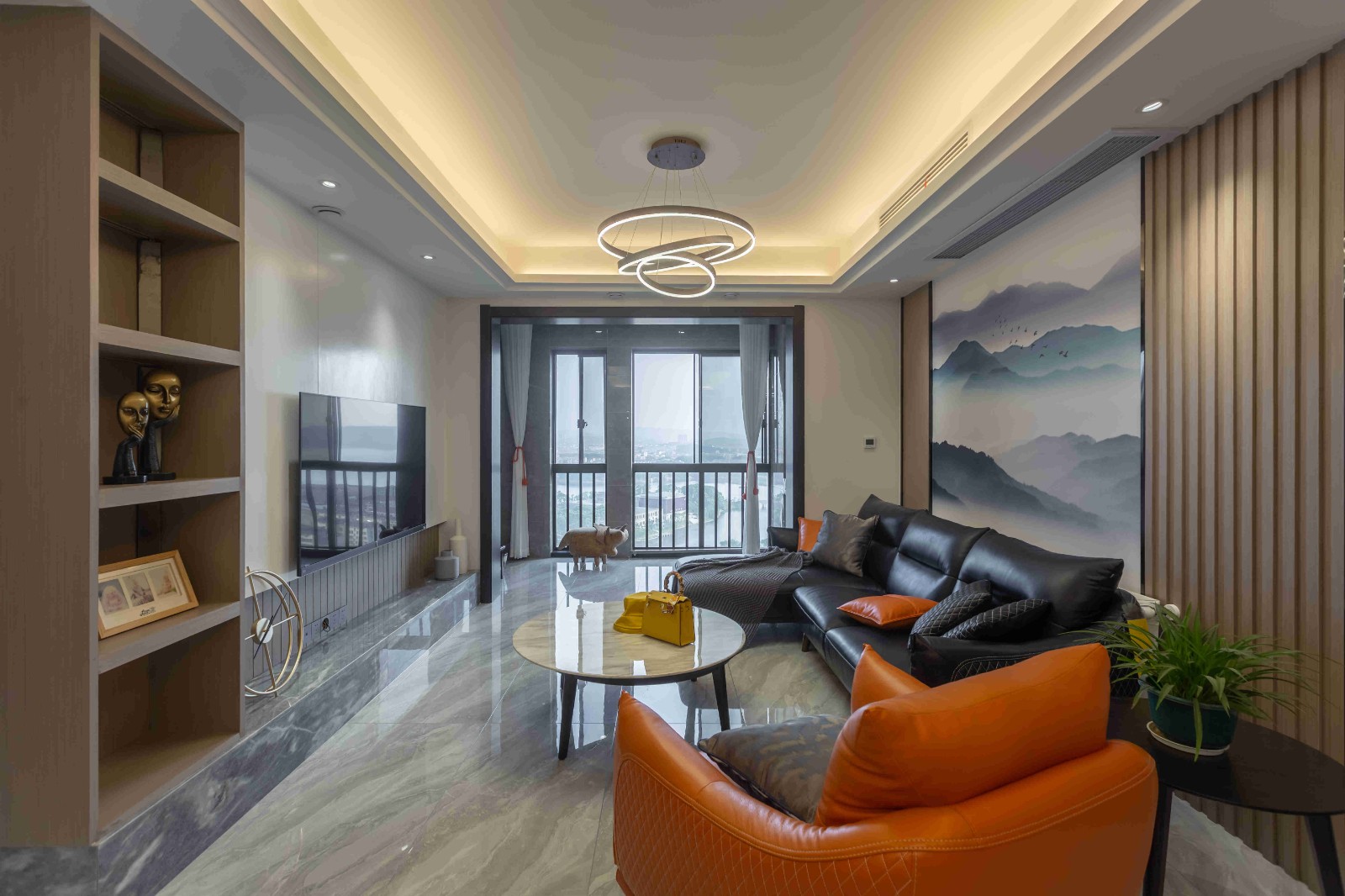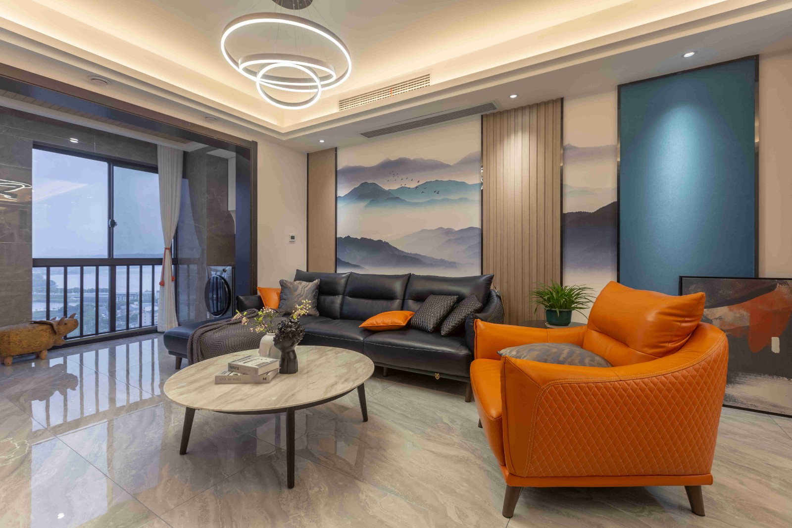 橙色單人皮質沙發,造型獨特的工藝吊燈,電視墻左側佇立的木柜,都為客廳的灰藍白色調增添了色彩。