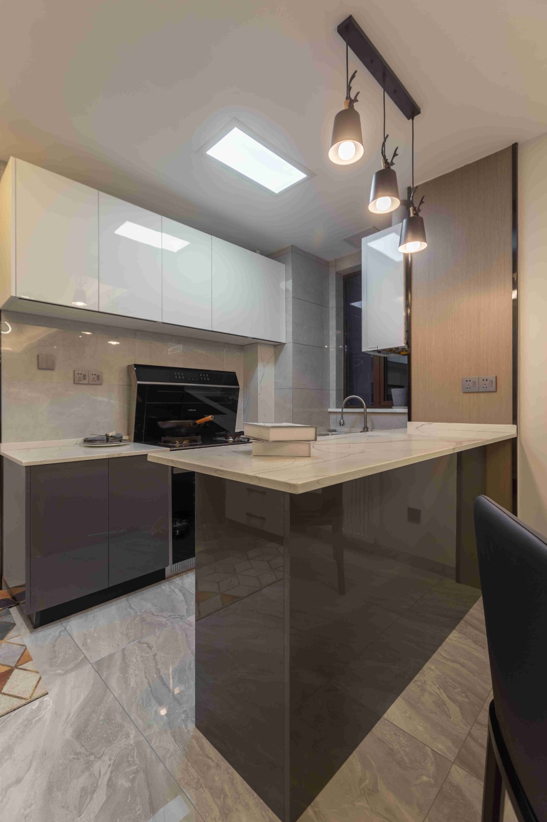 原戶型里,廚房不大,加上業主的喜好,因此考慮敞開式吧臺結合中式大圓桌,加上多個收納柜,滿足了女主人的需求。