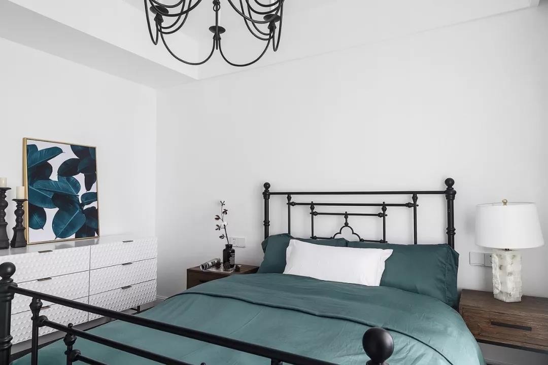 電視墻的設計也很有特色,在偏左的地方掛上一塊黑白相隔的毯子,在深灰色的電視墻上做了一個視覺沖擊的一個設計,讓電視墻看起來不單調,有個性。